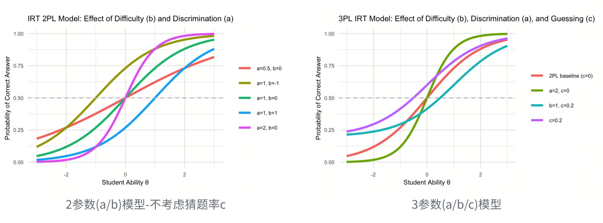 $$ P(\text{答对}\mid\theta)=c+(1-c)\frac{1}{1+e^{-a(\theta-b)}} $$