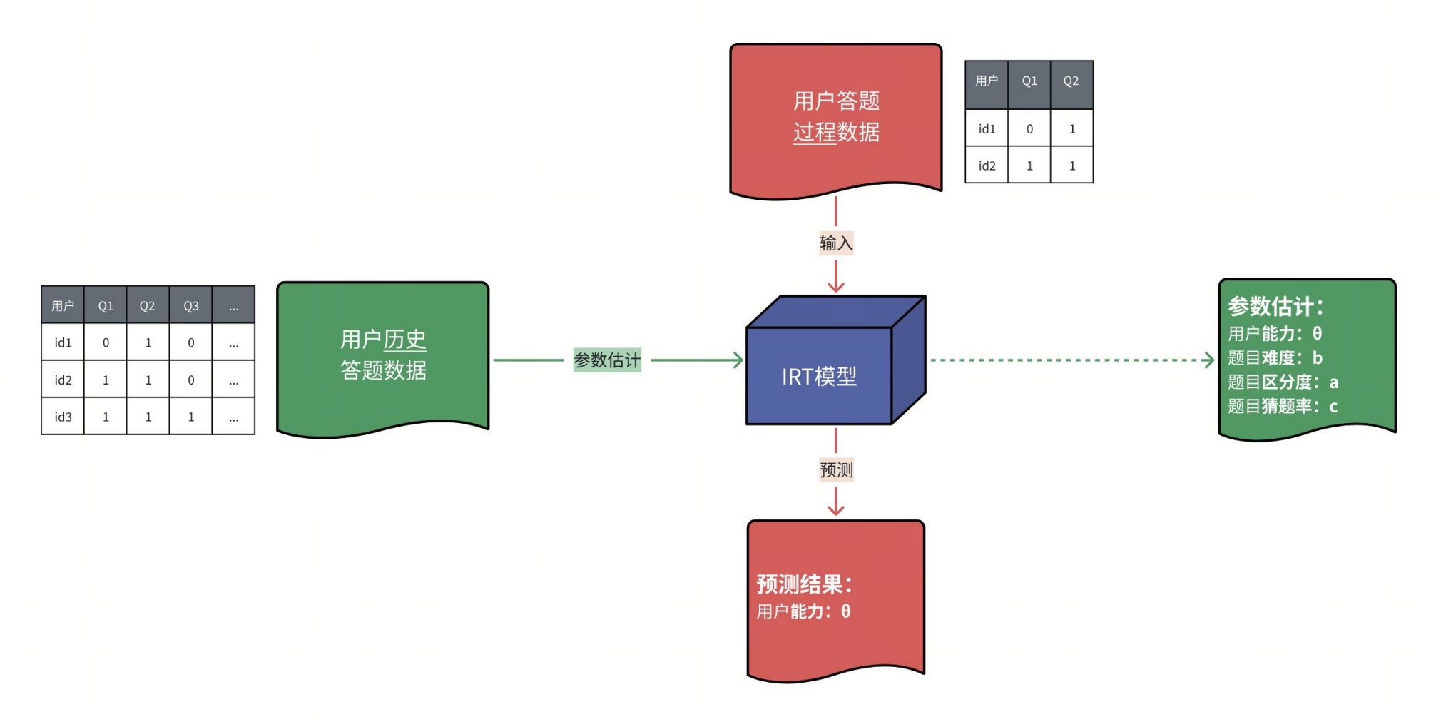 - 用户潜在能力(θ):个体未直接观测到的能力指标,例如数学能力、理解能力