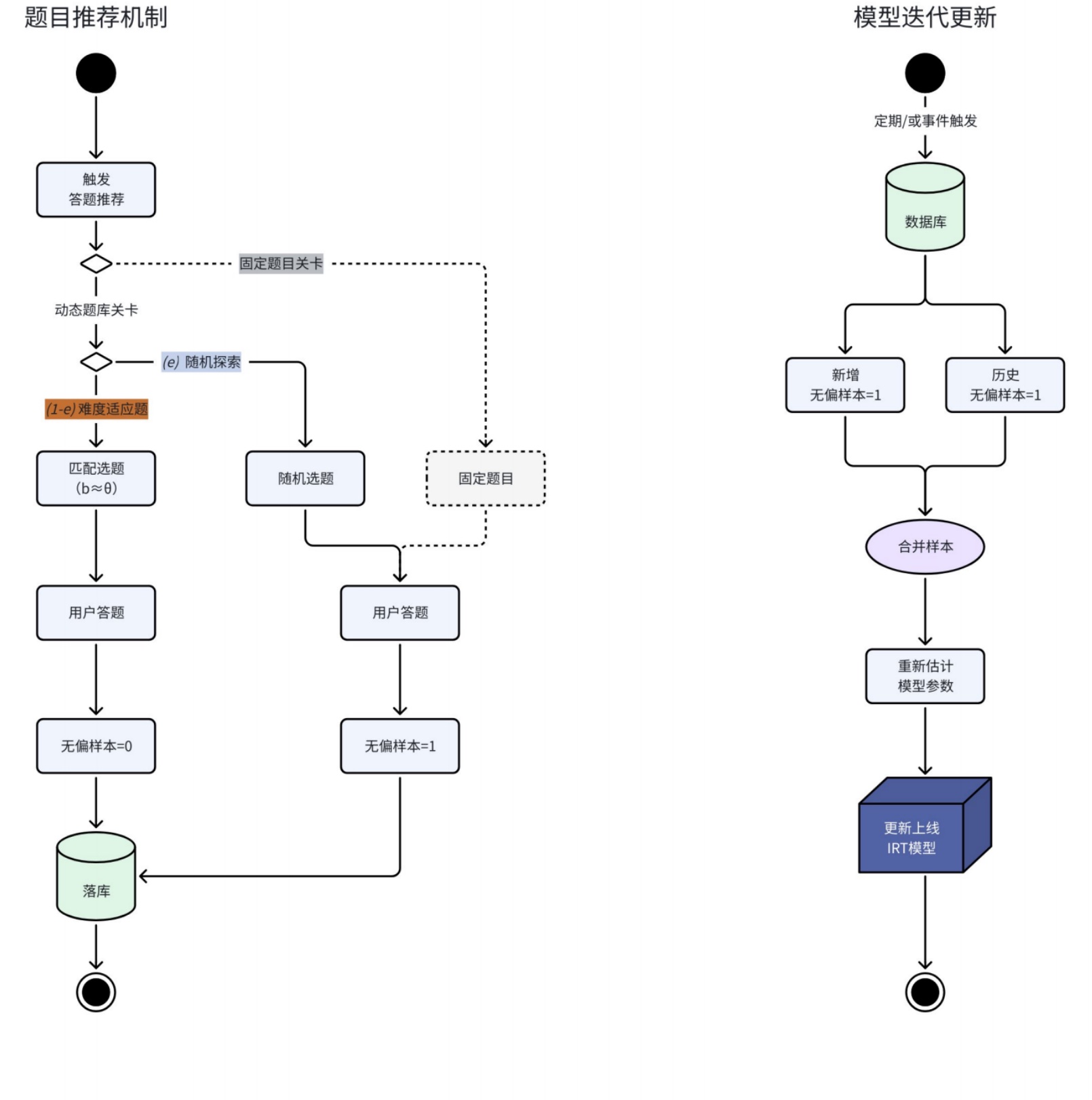 - 当系统持续根据难度b≈能力θ推荐题目,就会产生有偏样本,为了使模型可迭代,就需要定期无偏采样;